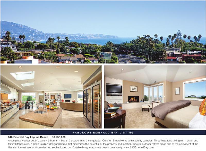 FA B U L O U S E M E R A L D B AY L I S T I N G 846 Emerald Bay Laguna Beach | $6,250,000 A complete wet bar butler’s pantry. 5 bdrms, 4 baths, 2 powder rms. 3 car garage. Crestron Smart Home with security cameras. Three fireplaces...living rm, master, and family kitchen area. A Scott Laidlaw designed home that maximizes the potential of the property and location. Several outdoor retreat areas add to the enjoyment of the lifestyle. A must see for those desiring sophisticated comfortable living in a private beach community. www.846EmeraldBay.com