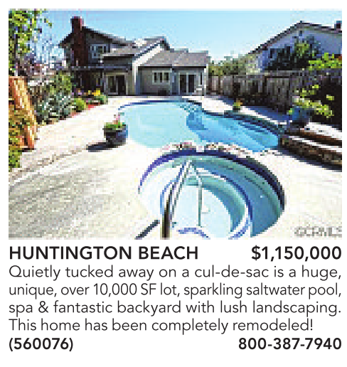 HUNTINGTON BEACH $1,150,000 Quietly tucked away on a cul-de-sac is a huge, unique,over10,000 SF lot, sparklingsaltwater pool, spa & fantastic backyard with lush landscaping. This home hasbeen completely remodeled! (560076) 800-387-7940