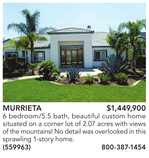 MURRIETA $1,449,900 6 bedroom/5.5 bath, beautiful custom home situated on a corner lot of 2.07 acres with views of themountains!Nodetailwas overlookedinthis sprawling1-story home. (559963) 800-387-1454