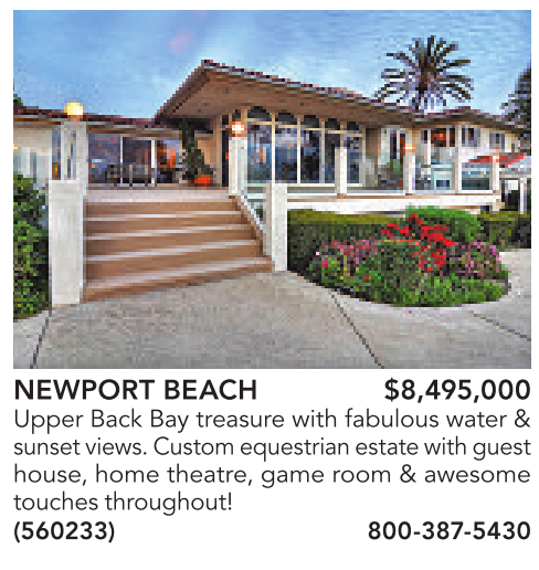 NEWPORT BEACH $8,495,000 Upper Back Bay treasure with fabulous water & sunset views. Customequestrianestatewithguest house, home theatre, game room & awesome touchesthroughout! (560233) 800-387-5430