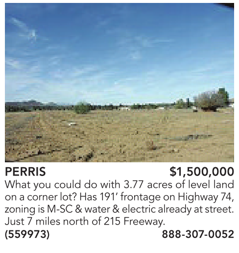 PERRIS $1,500,000 What you could do with 3.77 acres of level land on acornerlot?Has 191’ frontage on Highway 74, zoning is M-SC &water &electricalready at street. Just 7miles northof215 Freeway. (559973) 888-307-0052