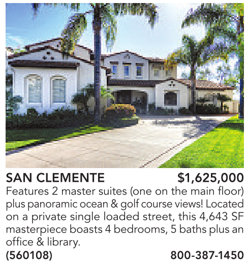 SAN CLEMENTE $1,625,000 Features 2 master suites (one on the main floor) plus panoramicocean &golf course views! Located on a private single loaded street, this 4,643 SF masterpieceboasts 4bedrooms, 5baths plus an office&library. (560108) 800-387-1450