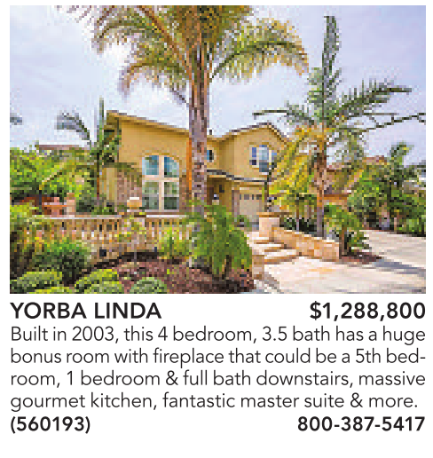 YORBA LINDA $1,288,800 Builtin2003, this 4bedroom,3.5 bath hasahuge bonusroom with fireplace that couldbea5th bedroom,1bedroom &fullbathdownstairs, massive gourmet kitchen, fantasticmastersuite &more. (560193) 800-387-5417