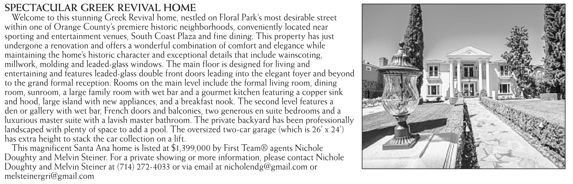 SPECTACULAR GREEK REVIVAL HOME Welcome to this stunning Greek Revival home, nestled on Floral Park’s most desirable street within one of Orange County’s premiere historic neighborhoods, conveniently located near sporting and entertainment venues, South Coast Plaza and fine dining. This property has just undergone a renovation and offers a wonderful combination of comfort and elegance while maintaining the home’s historic character and exceptional details that include wainscoting, millwork, molding and leaded-glass windows. The main floor is designed for living and entertaining and features leaded-glass double front doors leading into the elegant foyer and beyond to the grand formal reception. Rooms on the main level include the formal living room, dining room, sunroom, a large family room with wet bar and a gourmet kitchen featuring a copper sink and hood, large island with new appliances, and a breakfast nook. The second level features a den or gallery with wet bar, French doors and balconies, two generous en suite bedrooms and a luxurious master suite with a lavish master bathroom. The private backyard has been professionally landscaped with plenty of space to add a pool. The oversized two-car garage (which is 26’ x 24’) has extra height to stack the car collection on a lift. This magnificent Santa Ana home is listed at $1,399,000 by First Team® agents Nichole Doughty and Melvin Steiner. For a private showing or more information, please contact Nichole Doughty and Melvin Steiner at (714) 272-4033 or via email at nicholendg@gmail.com or melsteinergri@gmail.com