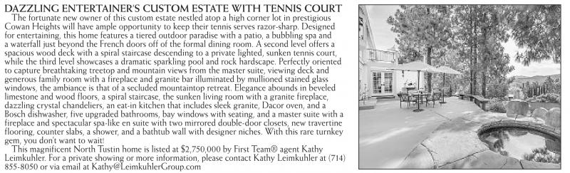 DAZZLING ENTERTAINER’S CUSTOM ESTATE WITH TENNIS COURT The fortunate new owner of this custom estate nestled atop a high corner lot in prestigious Cowan Heights will have ample opportunity to keep their tennis serves razor-sharp. Designed for entertaining, this home features a tiered outdoor paradise with a patio, a bubbling spa and a waterfall just beyond the French doors off of the formal dining room. A second level offers a spacious wood deck with a spiral staircase descending to a private lighted, sunken tennis court, while the third level showcases a dramatic sparkling pool and rock hardscape. Perfectly oriented to capture breathtaking treetop and mountain views from the master suite, viewing deck and generous family room with a fireplace and granite bar illuminated by mullioned stained glass windows, the ambiance is that of a secluded mountaintop retreat. Elegance abounds in beveled limestone and wood floors, a spiral staircase, the sunken living room with a granite fireplace, dazzling crystal chandeliers, an eat-in kitchen that includes sleek granite, Dacor oven, and a Bosch dishwasher, five upgraded bathrooms, bay windows with seating, and a master suite with a fireplace and spectacular spa-like en suite with two mirrored double-door closets, new travertine flooring, counter slabs, a shower, and a bathtub wall with designer niches. With this rare turnkey gem, you don’t want to wait! This magnificent North Tustin home is listed at $2,750,000 by First Team® agent Kathy Leimkuhler. For a private showing or more information, please contact Kathy Leimkuhler at (714) 855-8050 or via email at Kathy@LeimkuhlerGroup.com