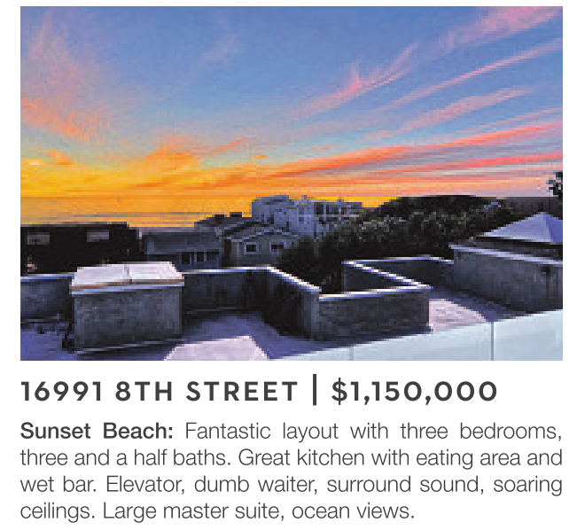 Sunset Beach: Fantastic layout with three bedrooms, three and a half baths. Great kitchen with eating area and wet bar. Elevator, dumb waiter, surround sound, soaring ceilings. Large master suite, ocean views.