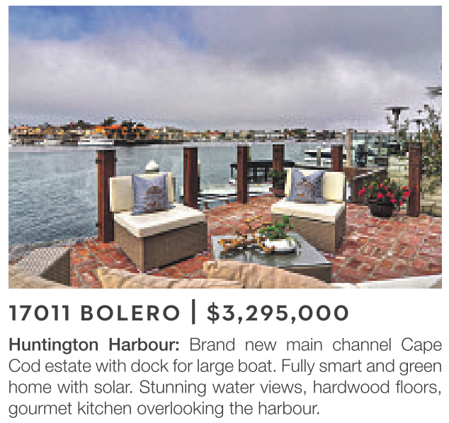 Huntington Harbour: Brand new main channel Cape Cod estate with dock for large boat. Fully smart and green home with solar. Stunning water views, hardwood floors, gourmet kitchen overlooking the harbour.