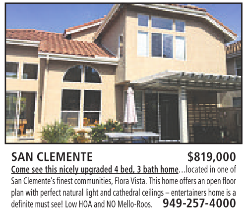 SanClemente’s finestcommunities,Flora Vista. This home offersanopenfloor plan with perfectnatural lightand cathedral ceilings –entertainershome is a definite must see! LowHOA andNOMello-Roos. 949-257-4000