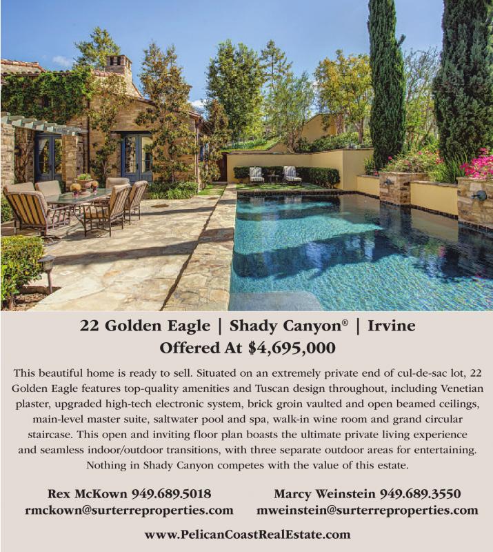 22 Golden Eagle | Shady Canyon ® | Irvine Offered At $4,695,000 This beautiful home is ready to sell. Situated on an extremely private end of cul-de-sac lot, 22 Golden Eagle features top-quality amenities and Tuscan design throughout, including Venetian plaster, upgraded high-tech electronic system, brick groin vaulted and open beamed ceilings, main-level master suite, saltwater pool and spa, walk-in wine room and grand circular staircase. This open and inviting floor plan boasts the ultimate private living experience and seamless indoor/outdoor transitions, with three separate outdoor areas for entertaining. Nothing in Shady Canyon competes with the value of this estate. Rex McKown 949.689.5018 rmckown@surterreproperties.com Marcy Weinstein 949.689.3550 mweinstein@surterreproperties.com www.PelicanCoastRealEstate.com