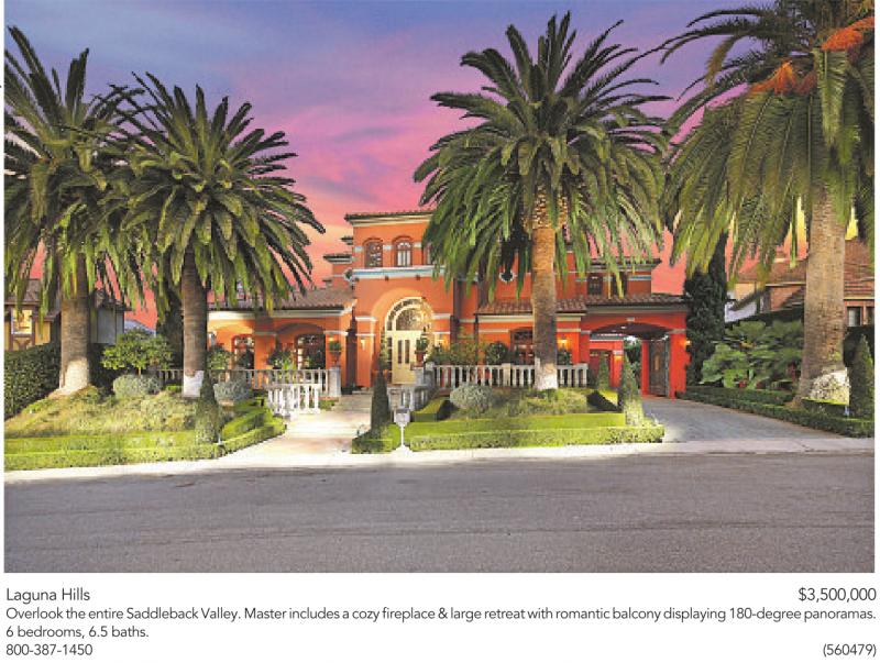 Laguna Hills $3,500,000 Overlook the entire Saddleback Valley. Master includes acozy fireplace &large retreat with romantic balcony displaying 180-degree panoramas. 6bedrooms, 6.5 baths. 800-387-1450 (560479)