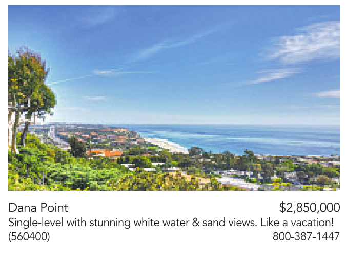 Dana Point $2,850,000 Single-level with stunning white water &sand views. Like avacation! (560400) 800-387-1447