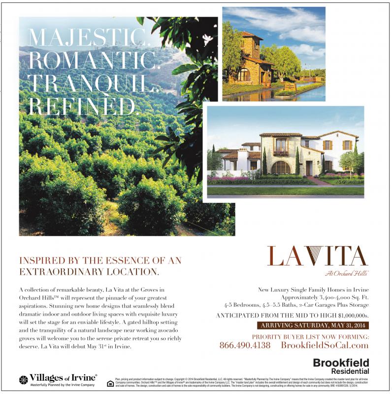 MAJESTIC. ROMANTIC. TRANQUIL. REFINED. INSPIRED BY THE ESSENCE OF AN EXTRAORDINARY LOCATION. A collection of remarkable beauty, La Vita at the Groves in Orchard Hills™ will represent the pinnacle of your greatest aspirations. Stunning new home designs that seamlessly blend dramatic indoor and outdoor living spaces with exquisite luxury will set the stage for an enviable lifestyle. A gated hilltop setting and the tranquility of a natural landscape near working avocado groves will welcome you to the serene private retreat you so richly 1 st in Irvine. New Luxury Single Family Homes in Irvine ANTICIPATED FROM THE MID TO HIGH $1,000,000s. ARRIVING SATURDAY, MAY 31, 2014 PRIORITY BUYER LIST NOW FORMING: 866.490.4138 Plan, pricing and product information subject to change. Copyright ©2014 Brookfield Residential, LLC. All rights reserved. “Masterfully Planned by The Irvine Company” means that the Irvine Company created the master land plan for all Irvine Company communities. Orchard Hills™ and the Villages of Irvine are trademarks of the Irvine Company LLC. The “master land plan”includes the overall entitlement and design of each community but does not include the design, construction ® and sale of homes. The design, construction and sale of homes is the sole responsibility of community builders. The Irvine Company is not designing, constructing or offering homes for sale in any community.BRE #00991326. 5/2014.