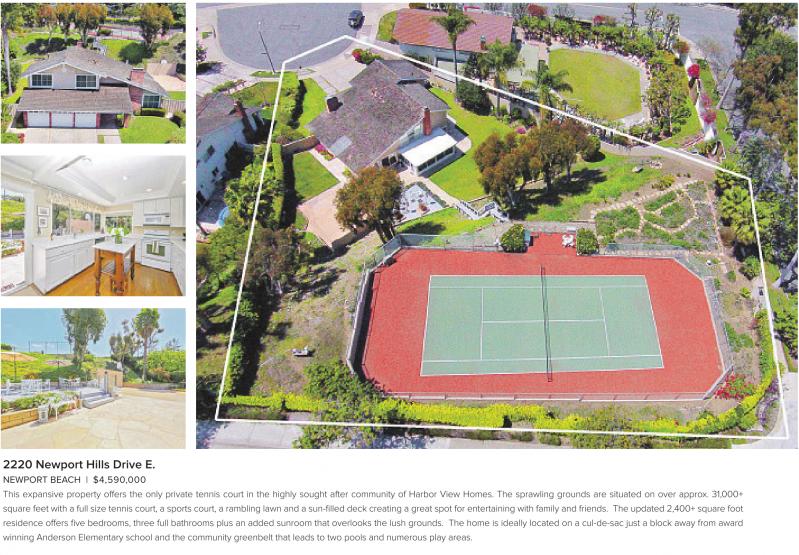 2220 Newport Hills Drive E. NEWPORT BEACH | $4,590,000 This expansive property offers the only private tennis court in the highly sought after community of Harbor View Homes. The sprawling grounds are situated on over approx. 31,000+ square feet with a full size tennis court, a sports court, a rambling lawn and a sun-filled deck creating a great spot for entertaining with family and friends. The updated 2,400+ square foot residence offers five bedrooms, three full bathrooms plus an added sunroom that overlooks the lush grounds. The home is ideally located on a cul-de-sac just a block away from award winning Anderson Elementary school and the community greenbelt that leads to two pools and numerous play areas.