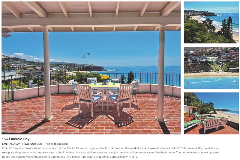 156 Emerald Bay EMERALD BAY | $38,000,000 | Visit: 156eb.com Emerald Bay is a private beach community on the Pacific Ocean in Laguna Beach. First time on the market since it was developed in 1932, 156 Emerald Bay provides an exceptional opportunity for the new owner to build a beachfront estate like no other or enjoy the historic five bedroom and five bath home. The home features its own private beach and cabana within the property boundaries. The ocean front estate property is approximately ½ acre.