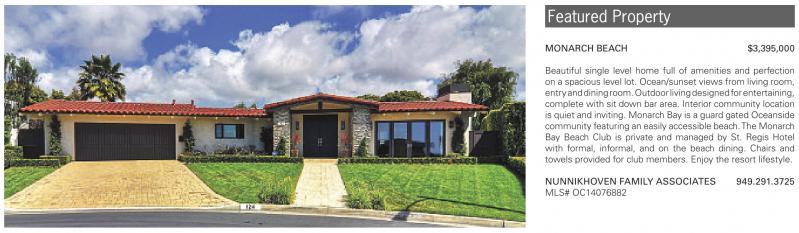 Featured Property MONARCH BEACH $3,395,000 Beautiful single level home full of amenities and perfection on a spacious level lot. Ocean/sunset views from living room, entryanddiningroom.Outdoorlivingdesignedforentertaining, complete with sit down bar area. Interior community location is quiet and inviting. Monarch Bay is a guard gated Oceanside communityfeaturing an easily accessible beach.TheMonarch Bay Beach Club is private and managed by St. Regis Hotel with formal, informal, and on the beach dining. Chairs and towels provided for club members. Enjoy the resort lifestyle. NUNNIKHOVEN FAMILY ASSOCIATES 949.291.3725 MLS# OC14076882