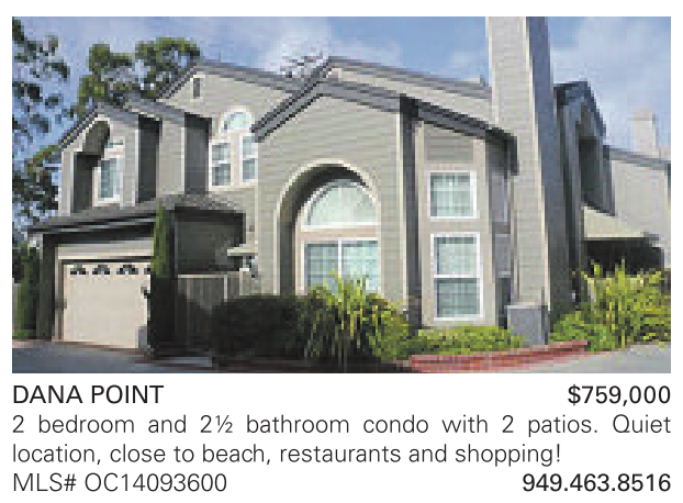 DANA POINT $759,000 2 bedroom and 2½ bathroom condo with 2 patios. Quiet location, close to beach, restaurants and shopping! MLS# OC14093600 949.463.8516