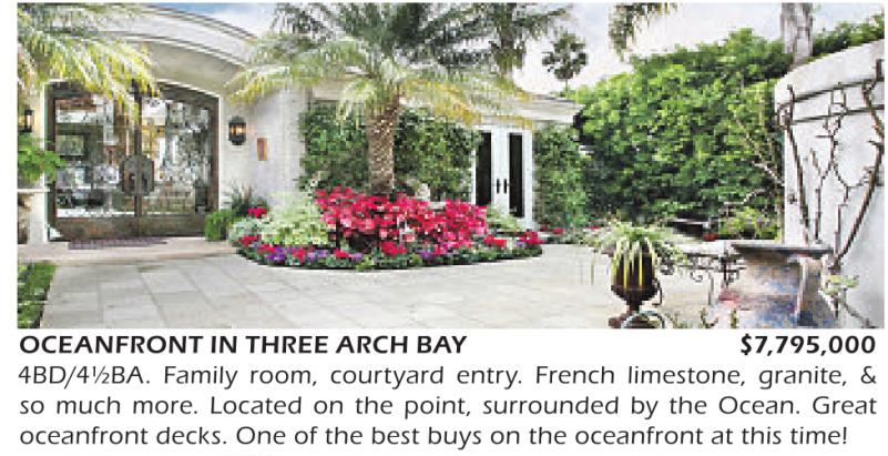 OCEANFRONT IN THREE ARCH BAY $7,795,000 4BD/4½BA. Family room, courtyard entry. French limestone, granite, & so much more. Located on the point, surrounded by the Ocean. Great oceanfront decks. One of the best buys on the oceanfront at this time!