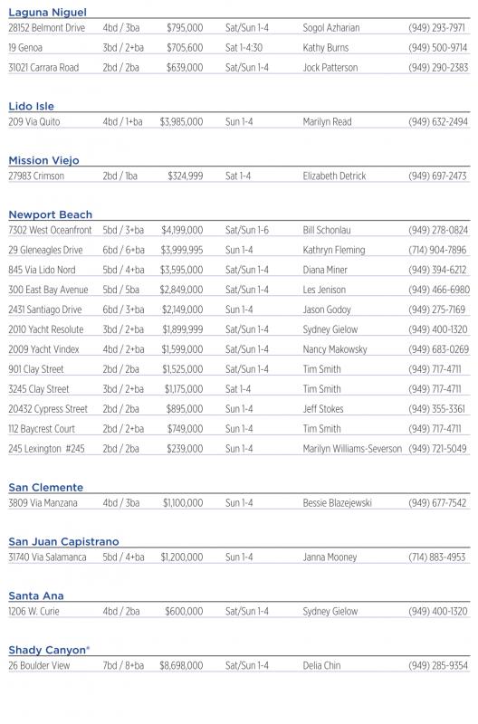Newport Beach 7302 West Oceanfront 5bd /3+ba $4,199,000 Sat/Sun 1-6 Bill Schonlau (949) 278-0824 29 Gleneagles Drive 6bd /6+ba $3,999,995 Sun 1-4 Kathryn Fleming (714) 904-7896 845Via Lido Nord 5bd /4+ba $3,595,000 Sat/Sun 1-4 Diana Miner (949) 394-6212 300 EastBay Avenue 5bd /5ba $2,849,000 Sat/Sun 1-4 LesJenison (949) 466-6980 2431 Santiago Drive 6bd /3+ba $2,149,000 Sun 1-4 Jason Godoy (949) 275-7169 2010 YachtResolute 3bd /2+ba $1,899,999 Sat/Sun 1-4 SydneyGielow (949) 400-1320 2009 YachtVindex 4bd /2+ba $1,599,000 Sat/Sun 1-4 NancyMakowsky (949) 683-0269 901ClayStreet 2bd /2ba $1,525,000 Sat/Sun 1-4 TimSmith (949) 717-4711 3245 ClayStreet 3bd /2+ba $1,175,000 Sat1-4 TimSmith (949) 717-4711 20432 CypressStreet 2bd /2ba $895,000 Sun 1-4 Jeff Stokes (949) 355-3361 112 Baycrest Court 2bd /2+ba $749,000 Sun 1-4 TimSmith (949) 717-4711 245Lexington #245 2bd /2ba $239,000 Sun 1-4 Marilyn Williams-Severson (949) 721-5049