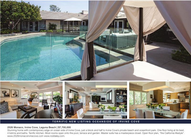 T E R R I F I C N E W L I S T I N G O C E A N S I D E O F I R V I N E C O V E 2526 Monaco, Irvine Cove, Laguna Beach | $7,700,000 Stunning home with contemporary edge on ocean side of Irvine Cove, just a block and half to Irvine Cove’s private beach and oceanfront park. One floor living at its best. 4 bdrms and baths. Terrific kitchen. Most rooms open onto the pool, terrace and garden. Master suite has a masterpiece closet. Open floor plan, “the California lifestyle”. www.2526monacoirvinecove.com www.roddaley.com.