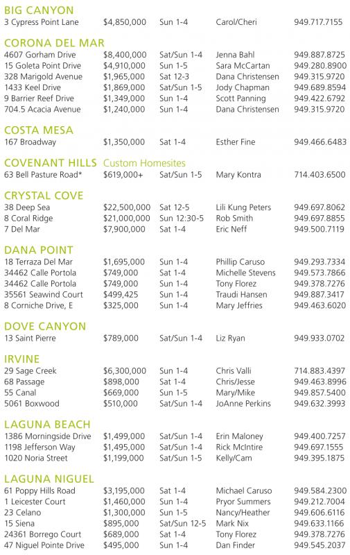 4607 Gorham Drive $8,400,000 Sat/Sun 1-4 Jenna Bahl 949.887.8725 15 Goleta Point Drive $4,910,000 Sun 1-5 Sara McCartan 949.280.8900 328 Marigold Avenue $1,965,000 Sat 12-3 Dana Christensen 949.315.9720 1433 Keel Drive $1,869,000 Sat/Sun 1-5 Jody Chapman 949.689.8594 9 Barrier Reef Drive $1,349,000 Sun 1-4 Scott Panning 949.422.6792 704.5 Acacia Avenue $1,240,000 Sun 1-4 Dana Christensen 949.315.9720