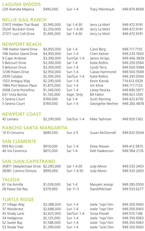 748 Harbor Island Drive $4,950,000 Sat 1-4 Carol Berg 949.717.7155 748 Harbor Island Drive $4,950,000 Sun 1-4 Cheri Ketner 949.233.7600 9 Cape Andover $3,390,000 Sun/Sat 1-4 Janice Arrigo 949.466.3839 5 Belcourt Drive $3,300,000 Sat 1-4 Katie Rollins 949.293.0594 5 Belcourt Drive $3,300,000 Sun 1-4 Cyndi Terry 949.500.5084 1238 Polaris Drive $2,950,000 Sun 1-4 Cassie Hammond 949.500.5569 2939 Catalpa $2,595,000 Sat/Sun 1-4 Katie Rollins 949.293.0594 1323 Antigua Way $2,295,000 Sun 1-4 Kevin Kanda 714.612.0529 1984 Port Nelson Place $1,875,000 Sun 1-4 Jim Kline 949.717.7123 3068 Corte Portofino $1,349,000 Sun 1-4 Laney Pesicka 949.690.5977 631 Vista Bonita $1,100,000 Appt. Only Bill Fallon 949.923.1205 5 Serena Court $769,000 Sat 1-4 Scott Panning 949.422.6792 5 Serena Court $769,000 Sun 1-4 Georgette Werline 949.283.4878