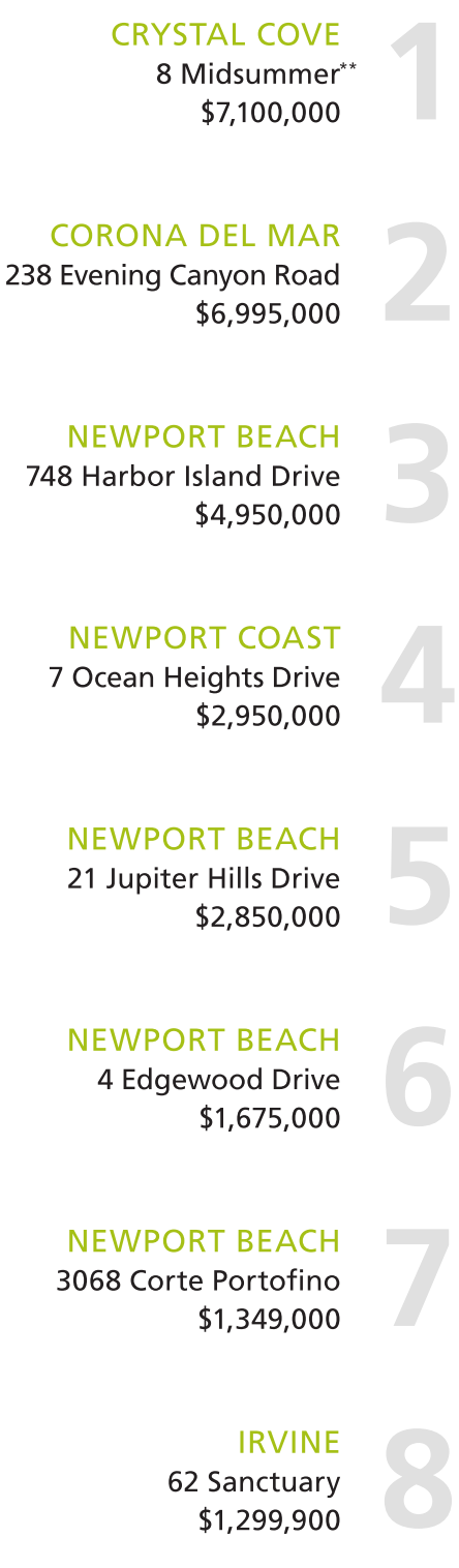 CRYSTAL COVE 8 Midsummer $7,100,000 ** CORONA DEL MAR 238 Evening Canyon Road $6,995,000 1 2 NEWPORT BEACH 748 Harbor Island Drive $4,950,000 3 NEWPORT COAST 7 Ocean Heights Drive $2,950,000 4 NEWPORT BEACH 21 Jupiter Hills Drive $2,850,000 5 NEWPORT BEACH 4 Edgewood Drive $1,675,000 6 NEWPORT BEACH 3068 Corte Portofino $1,349,000 7 IRVINE 62 Sanctuary $1,299,900 8