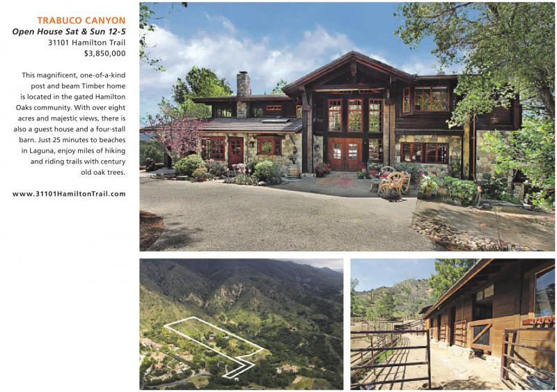 TRABUCO CANYON Open House Sat & Sun 12-5 31101 Hamilton Trail $3,850,000 This magnificent, one-of-a-kind post and beam Timber home is located in the gated Hamilton Oaks community. With over eight acres and majestic views, there is also a guest house and a four-stall barn. Just 25 minutes to beaches in Laguna, enjoy miles of hiking and riding trails with century old oak trees. www.31101HamiltonTrail.com