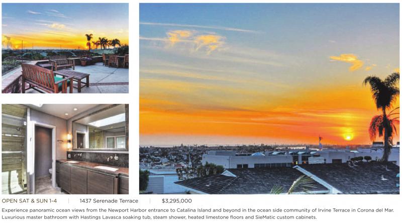 OPEN SAT & SUN 1-4 | 1437 Serenade Terrace | $3,295,000 Experience panoramic ocean views from the Newport Harbor entrance to Catalina Island and beyond in the ocean side community of Irvine Terrace in Corona del Mar. Luxurious master bathroom with Hastings Lavasca soaking tub, steam shower, heated limestone floors and SieMatic custom cabinets.