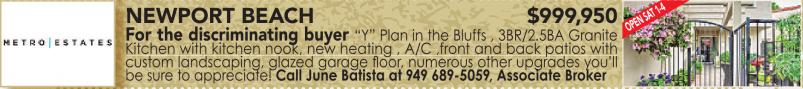 NEWPORT BEACH $999,950 For the discriminating buyer “Y” Plan in the Bluffs , 3BR/2.5BA Granite Kitchen with kitchen nook, new heating , A/C ,front and back patios with custom landscaping, glazed garage floor, numerous other upgrades you’ll be sure to appreciate! Call June Batista at 949 689-5059, Associate Broker