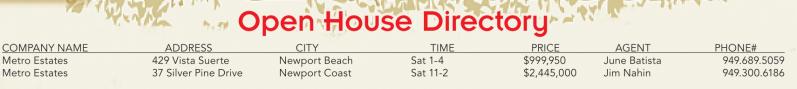 Open House Directory COMPANY NAME ADDRESS CITY TIME PRICE AGENT PHONE# Metro Estates 429 Vista Suerte Newport Beach Sat 1-4 $999,950 June Batista 949.689.5059 Metro Estates 37 Silver Pine Drive Newport Coast Sat 11-2 $2,445,000 Jim Nahin 949.300.6186
