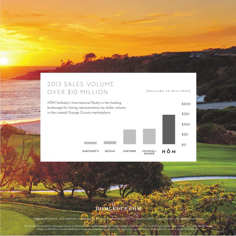 2 0 1 3 S A L E S VO LU M E OV E R $ 1 0 M I L L I O N HÔM Sotheby’s International Realty is the leading brokerage for listing representation by dollar volume in the coastal Orange County marketplace [ D O L L A R S I N M I L L I O N S ] $200 $150 HARCOURT’S RE/MAX SURTERRE COLDWELL BANKER H Ô M $100 $50 $0 HOMGROUP. COM corporate office 1200 newport center drive, suite 100 . newport beach, california 92660 . 949.554.1200 . info@homgroup.com The information included on these pages is based on information from California Regional Multiple Listing as of [01.01.2013-12.31.2013] and/or the last twelvemonths, for Coastal Orange County. Display of MLS data is deemed reliable but is not guaranteed accurate by the MLS. The information represents activity of all brokers but does not include off-market sales.