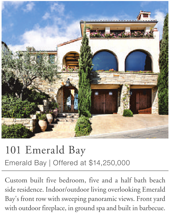 101 Emerald Bay Emerald Bay | Offered at $14,250,000 Custom built five bedroom, five and a half bath beach side residence. Indoor/outdoor living overlooking Emerald Bay's front row with sweeping panoramic views. Front yard with outdoor fireplace, in ground spa and built in barbecue.