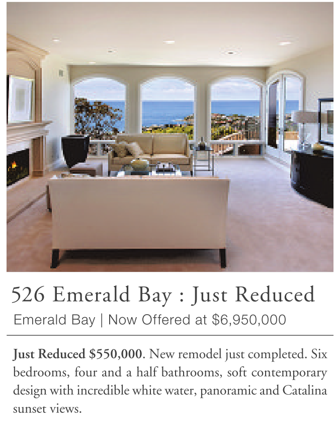 526 Emerald Bay : Just Reduced Emerald Bay | Now Offered at $6,950,000 Just Reduced $550,000. New remodel just completed. Six bedrooms, four and a half bathrooms, soft contemporary design with incredible white water, panoramic and Catalina sunset views.