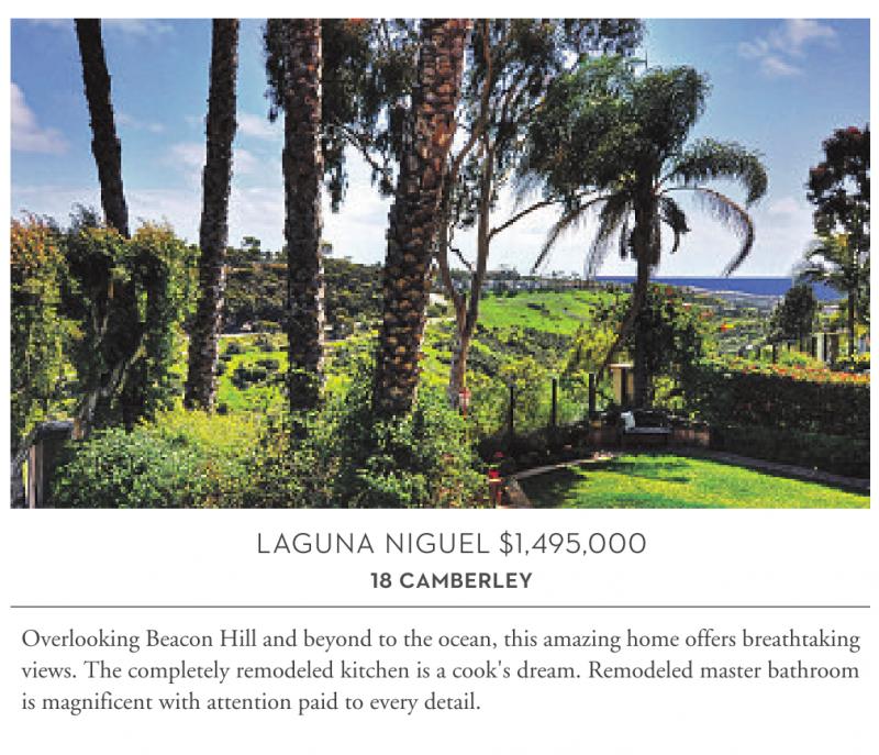 LAGUNA NIGUEL $1,495,000 18 CAMBERLEY Overlooking Beacon Hill and beyond to the ocean, this amazing home offers breathtaking views. The completely remodeled kitchen is a cook's dream. Remodeled master bathroom is magnificent with attention paid to every detail.