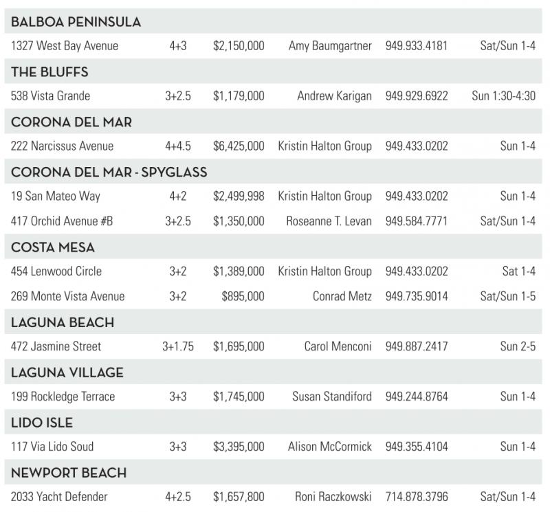 BALBOAPENINSU 1327 West Bay Avenue 4+3 $2,150,000 Amy Baumgartner 949.933.4181 Sat/Sun 1-4 THE BLUFFS 538 Vista Grande 3+2.5 $1,179,000 Andrew Karigan 949.929.6922 Sun 1:30-4:30 CORONA DEL MAR 222 Narcissus Avenue 4+4.5 $6,425,000 Kristin Halton Group 949.433.0202 Sun 1-4 CORONA DEL MAR -SPYG SS 19 San Mateo Way 4+2 $2,499,998 Kristin Halton Group 949.433.0202 Sun 1-4 417 Orchid Avenue #B 3+2.5 $1,350,000 Roseanne T. Levan 949.584.7771 Sat/Sun 1-4 COSTA MESA 454 Lenwood Circle 3+2 $1,389,000 Kristin Halton Group 949.433.0202 Sat 1-4 269 Monte Vista Avenue 3+2 $895,000 Conrad Metz 949.735.9014 Sat/Sun 1-5 GUNA BEACH 472 Jasmine Street 3+1.75 $1,695,000 Carol Menconi 949.887.2417 Sun 2-5 GUNA VIL GE 199 Rockledge Terrace 3+3 $1,745,000 Susan Standiford 949.244.8764 Sun 1-4 LIDO ISLE 117 ViaLido Soud 3+3 $3,395,000 Alison McCormick 949.355.4104 Sun 1-4 NEWPORTBEACH 2033 Yacht Defender 4+2.5 $1,657,800 Roni Raczkowski 714.878.3796 Sat/Sun 1-4