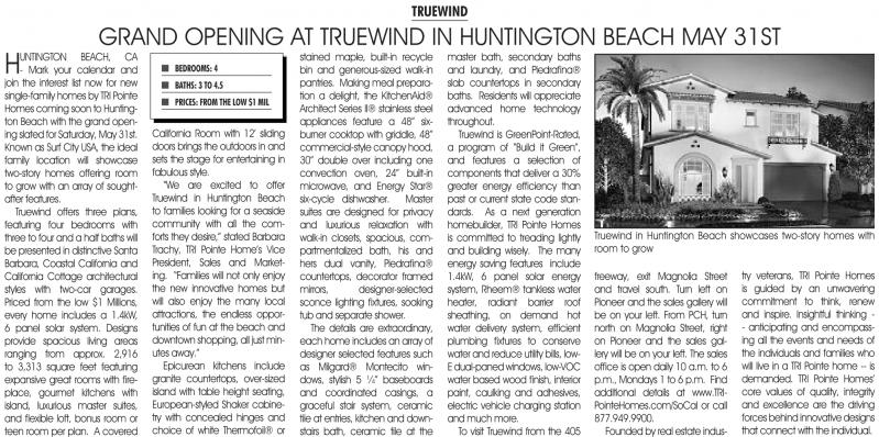 “We are excited to offer Truewind in Huntington Beach to families looking for a seaside community with all the comforts they desire,” stated Barbara Trachy, TRi Pointe Home’s Vice President, Sales and Marketing. “Families will not only enjoy the new innovative homes but will also enjoy the many local attractions, the endless opportunities of fun at the beach and downtown shopping, all just minutes away.”