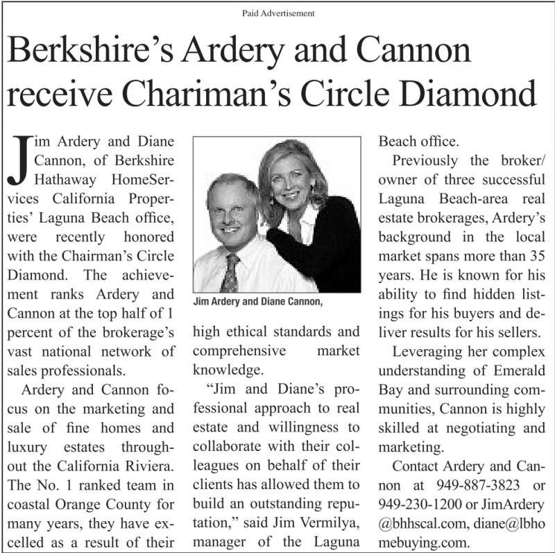 Ardery and Diane Cannon, of Berkshire Hathaway HomeServices California Properties’ Laguna Beach office, were recently honored with the Chairman’s Circle Diamond. The achievement ranks Ardery and Cannon at the top half of 1 percent of the brokerage’s vast national network of sales professionals.