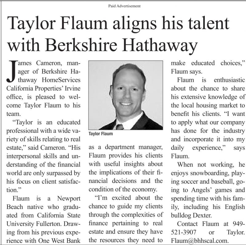 Contact Flaum at 949- 521-3907 or Taylor. Flaum@bhhscal.com.