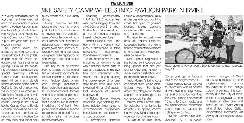 enthusiasts from all over the irvine area will have the opportunity to pedal down to Pavilion Park on Saturday, May 24th, as the first Great Park Neighborhood hosts aBike Safety Camp from 10 a.m. to 2 p.m. Everyone who rides a bicycle is invited.