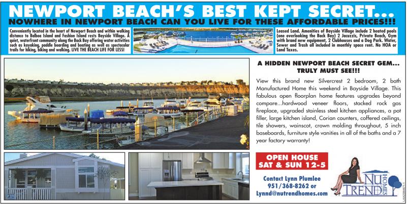 NEWPORT BEACH’S BEST KEPT SECRET... NOWHERE IN NEWPORT BEACH CAN YOU LIVE FOR THESE AFFORDABLE PRICES!!! Conveniently located in the heart of Newport Beach and within walking distance to Balboa Island and Fashion Island rests Bayside Village. A quiet, waterfront community along the Back Bay offering water activities such as kayaking, paddle boarding and boating as well as spectacular trails for hiking, biking and walking. LIVE THE BEACH LIFE FOR LESS! Leased Land. Amenities of Bayside Village include 2 heated pools (one overlooking the Back Bay) 2 Jacuzzis, Private Beach, Gym with brand new equipment, 2 Clubhouses and a Dog Park. Water, Sewer and Trash all included in monthly space rent. No HOA or Land Taxes. A HIDDEN NEWPORT BEACH SECRET GEM... TRULY MUST SEE!!! View this brand new Silvercrest 2 bedroom, 2 bath Manufactured Home this weekend in Bayside Village. This fabulous open floorplan home features upgrades beyond compare...hardwood veneer floors, stacked rock gas fireplace, upgraded stainless steel kitchen appliances, a pot filler, large kitchen island, Corian counters, coffered ceilings, tile showers, wainscot, crown molding throughout, 5 inch baseboards, furniture style vanities in all of the baths and a 7 year factory warranty! OPEN HOUSE SAT & SUN 12-5 Contact Lynn Plumlee 951/368-8262 or Lynnd@nutrendhomes.com