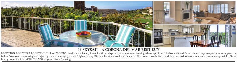 16 SKYSAIL - A CORONA DEL MAR BEST BUY LOCATION, LOCATION, LOCATION. Tri-level3BR./3BA. family homeideally locatedwithinthisprestigious communitytaking advantage of thefullGreenbelt andOceanviews.Large wrap around deck greatfor indoor/outdoor entertaining and enjoying the ever changing vistas. Bright and airy Kitchen, breakfast nook and den area. This home is ready for remodel and excited to have a new owner as soon as possible. Great family home. Call Bill at 949.632.2890 for your PrivateShowing.