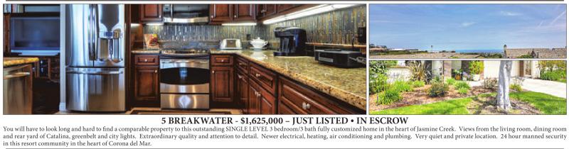 5 BREAKWATER - $1,625,000 – JUST LISTED • IN ESCROW Youwill have to look long andhardtofind acomparable property to this outstandingSINGLELEVEL 3bedroom/3 bath fully customizedhomeinthe heartofJasmine Creek. Views from thelivingroom, dining room andrearyardofCatalina, greenbeltand city lights. Extraordinary qualityand attention to detail. Newer electrical,heating,air conditioning andplumbing. Very quietand privatelocation. 24 hourmannedsecurity in this resort communityinthe heartofCoronadel Mar.