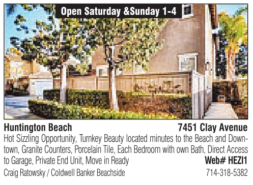 Open Saturday &Sunday 1-4 Huntington Beach 7451 Clay Avenue Craig Ratowsky /Coldwell Banker Beachside 714-318-5382 Hot Sizzling Opportunity,Turnkey Beauty located minutes to the Beach and Downtown, Granite Counters, Porcelain Tile, Each Bedroom with own Bath, Direct Access to Garage, Private End Unit, Move in Ready Web# HEZI1