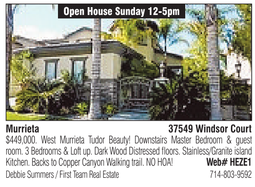 Open House Sunday 12-5pm Murrieta 37549 Windsor Court room. 3Bedrooms &Loft up. Dark Wood Distressed floors. Stainless/Granite island $449,000. West Murrieta Tudor Beauty! Downstairs Master Bedroom & guest Kitchen. Backs to Copper Canyon Walking trail. NO HOA! Web# HEZE1 Debbie Summers /First Team Real Estate 714-803-9592