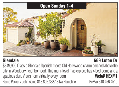 Open Sunday 1-4 Glendale 669 Luton Dr $849,900 Classic Glendale Spanish meets Old Hollywood charm perched above the city in Woodbury neighborhood. This multi-level masterpiece has 4bedrooms and aspacious den. Views from virtually every room Web# HEXM1 Remo Packer /John Aaroe 818.802.3887 Silva Hameline ReMax 310.456.4519