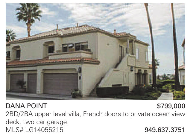 DANA POINT $799,000 2BD/2BA upper level villa, French doors to private ocean view deck, two car garage. MLS# LG14055215 949.637.3751