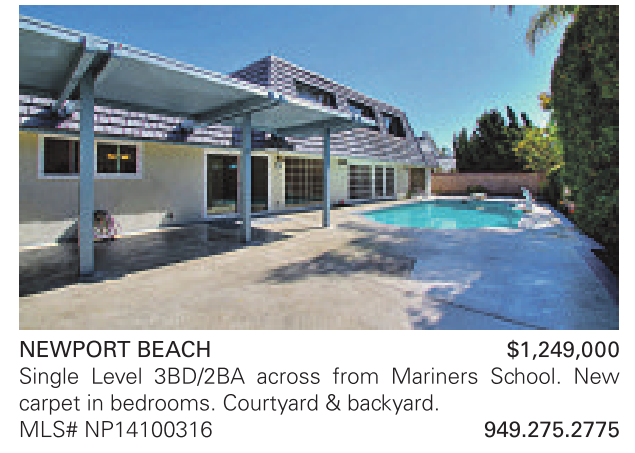 NEWPORT BEACH $1,249,000 Single Level 3BD/2BA across from Mariners School. New carpet in bedrooms. Courtyard & backyard. MLS# NP14100316 949.275.2775