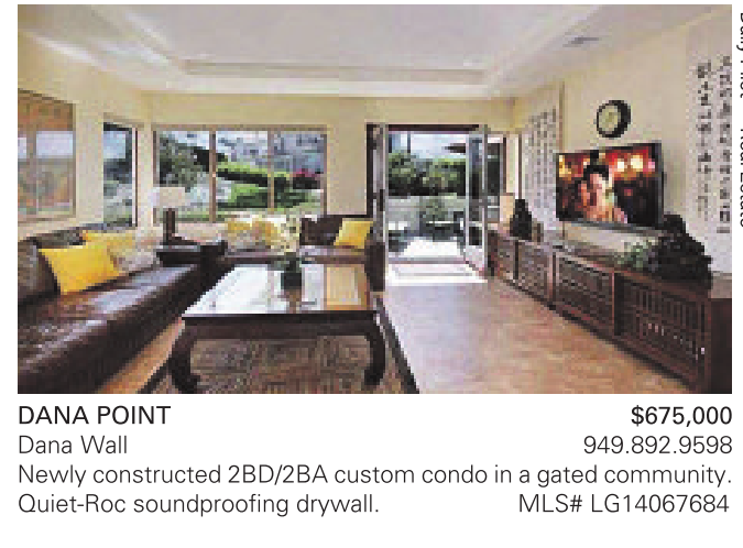DANA POINT $675,000 Dana Wall 949.892.9598 Newly constructed 2BD/2BA custom condo in agated community. Quiet-Roc soundproofing drywall. MLS# LG14067684