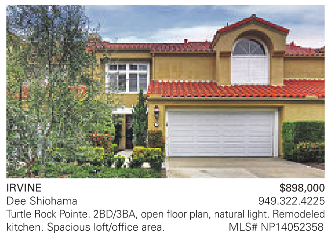 IRVINE $898,000 Dee Shiohama 949.322.4225 Turtle Rock Pointe. 2BD/3BA, open floor plan, natural light. Remodeled kitchen. Spacious loft/office area. MLS# NP14052358