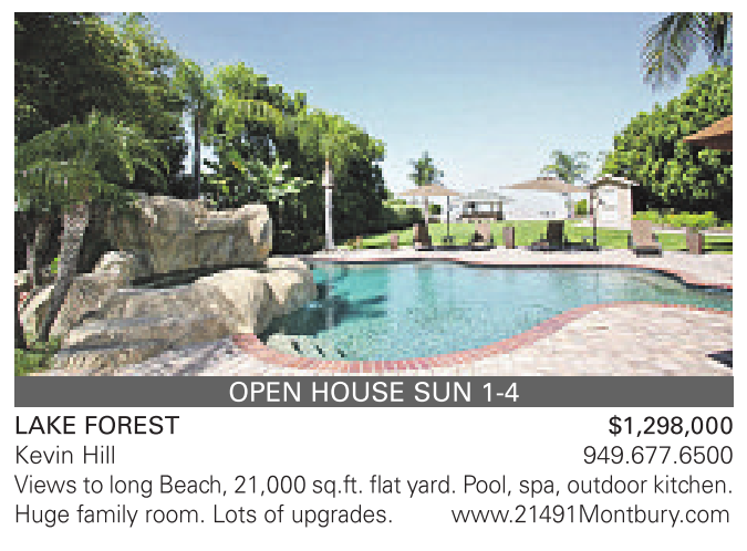 LAKE FOREST $1,298,000 Kevin Hill 949.677.6500 Views to long Beach, 21,000 sq.ft. flatyard. Pool, spa, outdoor kitchen. Huge family room. Lots of upgrades. www.21491Montbury.com